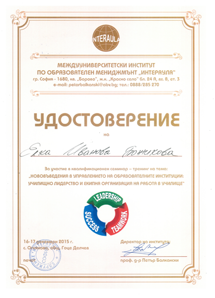 Завършен успешно квалификационен семинар - тренинг на тема: "Нововъведения в управлението на образователните институции: училищно лидерство и екипна организация на работа в училище"- 2015 г.