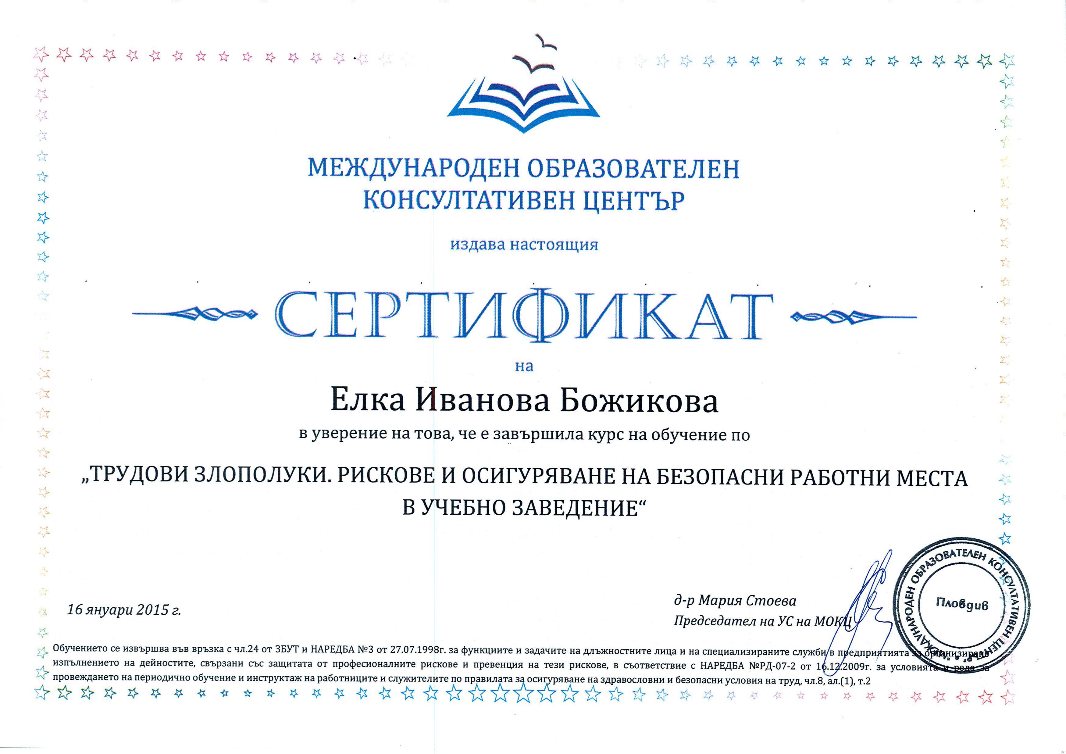 Завършен успешно курс на обучение на тема: "Трудови злополуки. Рискове и осигуряване на безопасни работни места в учебно заведение" - 2015 г.