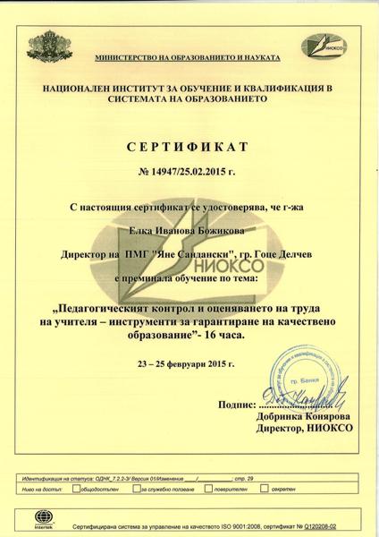 Завършен успешно курс на обучение на тема: "Педагогическият контрол и оценяването на труда на учителя - инструменти за гарантиране на качествено образование" - 2015 г.