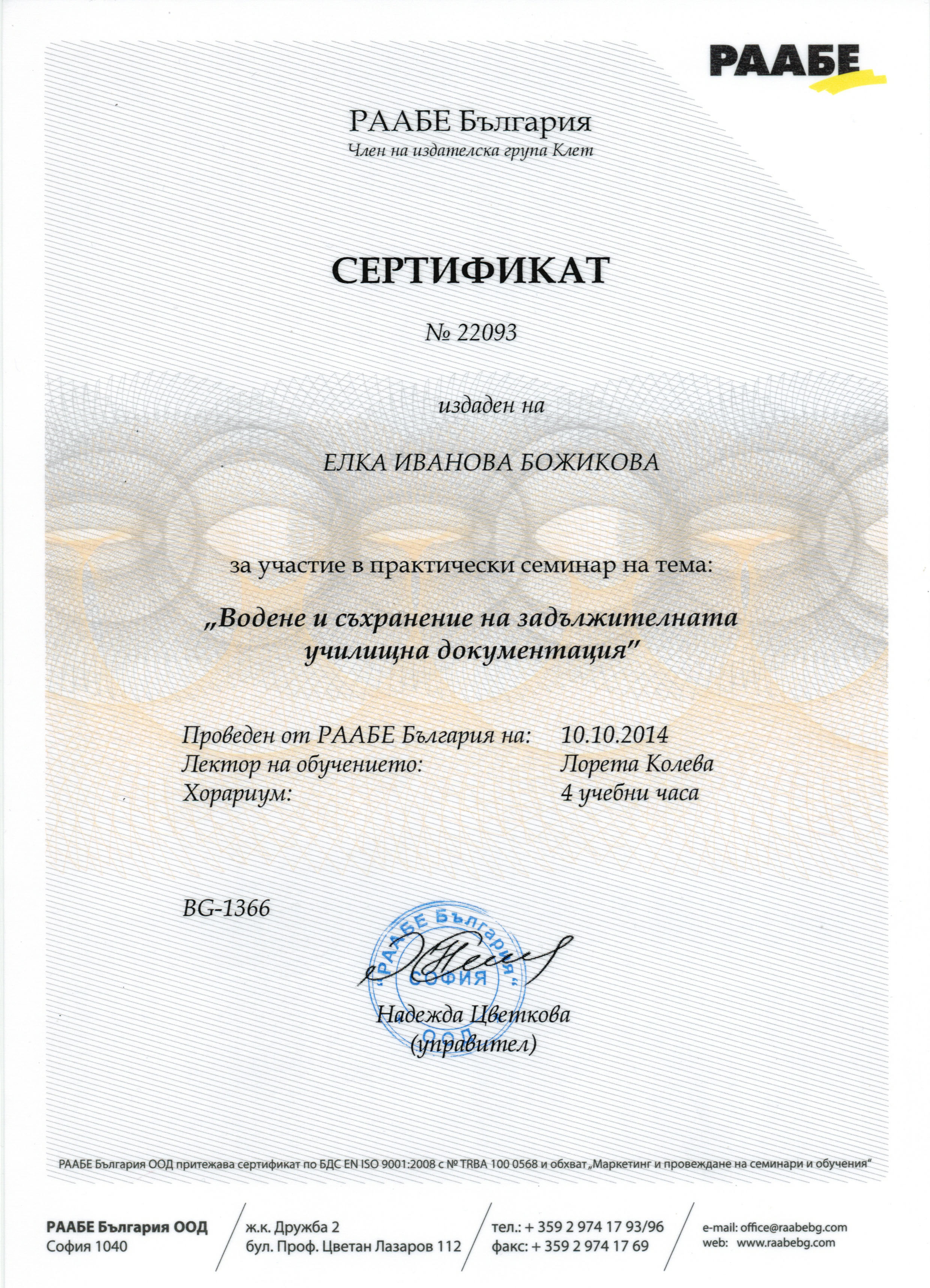 Завършен успешно практически семинар на тема: "Водене и съхранение на задължителната училищна документация" - 2014 г.