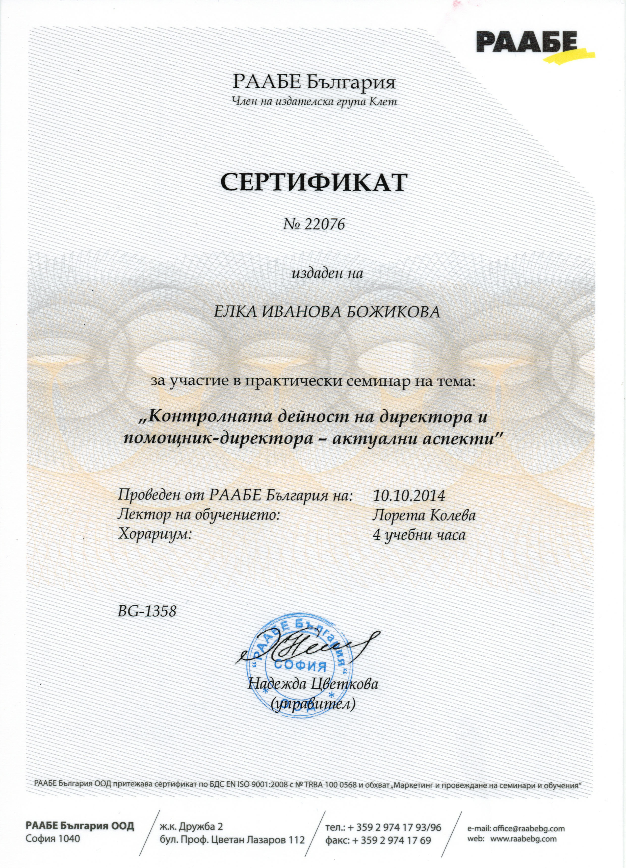Завършен успешно практически семинар на тема: "Контролната дейност на директора и помощник-директора - актуални аспекти" - 2014 г.