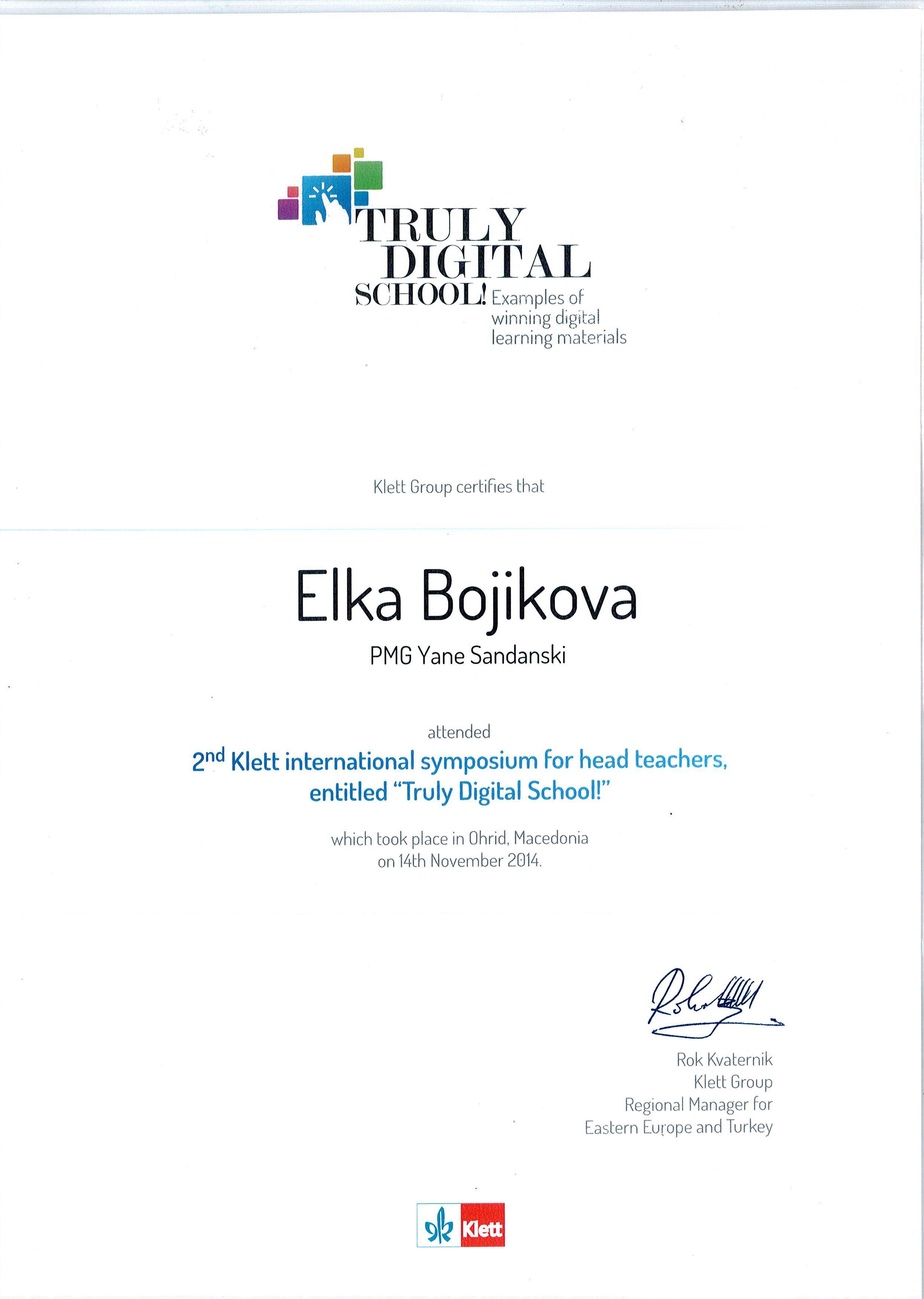 Завършен успешно семинар на тема: "2nd Klett International symposium for head teachers, entitled "Truly Digital School" - 2014 г.